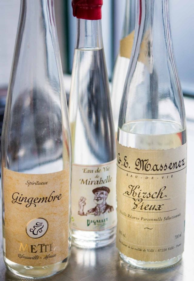 If you want to relive the good old days, you can double the amount of kirsch, but if you want to make it through dinner, Iโd stick to the proportions here. Kirsch is a clear distillation of cherries, thatโs rather potent, but widely available. However you can use another eau-de-vie. Iโve shown a few other bottles from my collection, above, or you could find another with a complimentary flavor to the apรฉritif wine, and use that.