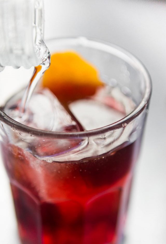 - Add a handful of ice and top off with sparkling water. Garnish with an orange twist and a few fresh cranberries.