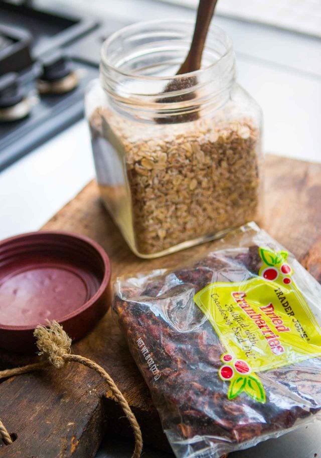 - In a large bowl, mix together the oats, brown sugar, flour, coconut, dried cranberries, baking soda, and salt. Add the water, melted butter, and golden syrup and stir until everything is well combined.