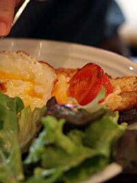 On the flip side of that, while the outdoor markets were closed, I had ordered some Emmenthal cheese from the grocery delivery service that Iโve been using. Emmenthal normally melts fine, but this one didnโt. (I prefer Comtรฉ or Gruyรจre.) It even resisted the charms, and flames, of my trusty blowtorch I hauled out when the broiler wasnโt having much impact on the cheese. It didnโt get all gooey and browned, as it usually does, while I watched the minutes ticked by, but it tasted just fine when I cut it in half and dove in. I panicked a little because I know readers like precise baking times, temperatures, etc., and I was going to give it another go, but Romain told me to drop it and just post the recipe.