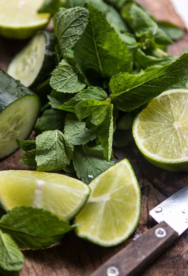 - Cut the cucumber into cubes. Put them in a blender, preferably a high-powered one, along with the mint and the sugar. Zest the limes right into the blender then add the juice of the limes to the blender along with a pinch of salt.