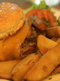 Iโd heard so much about Peter Luger that when my friends invited me to lunch there, I jumped on the chance. Since they only serve the burgers at lunch, everyone at the table chose that for lunch and since Iโm not one to pass up a burger, I joined them. The hamburgers are served plain, on an untoasted bun, with onions, and thatโs it. I asked for mustard, which seemed like a big surprise to everyone. (Donโt people still eat mustard on their hamburgers in America? Or did something happen in my absence..?)