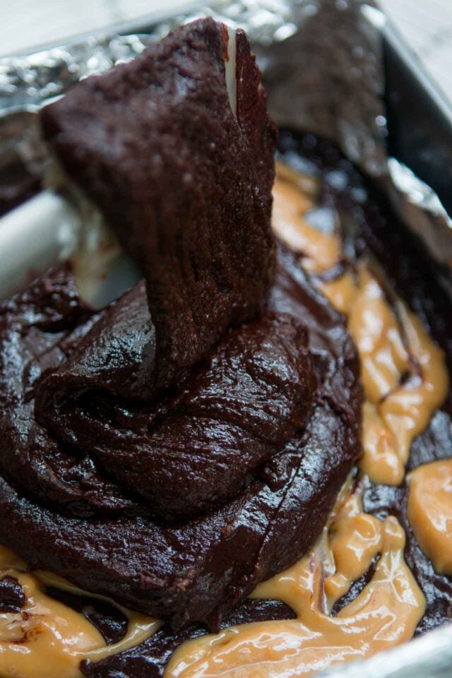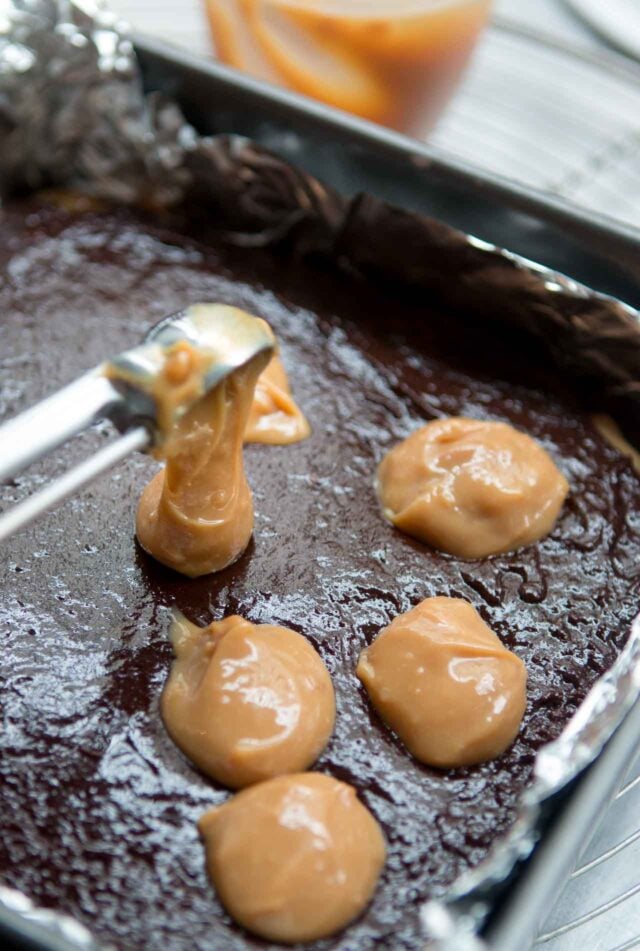 • Scrape half of the batter into the prepared pan. Drop one-third of the dulce de leche by scant tablespoons evenly spaced over the brownie batter. Either drag a butter knife through the dulce de leche mounds to swirl them very slightly, being careful not to overdo it, or leave the mounds as they are. Spread the remaining brownie batter over, then drop spoonfuls of the remaining dulce de Leche in dollops over the top of the brownie batter. Use a knife to swirl the dulce de Leche slightly.