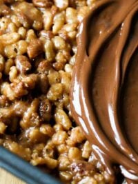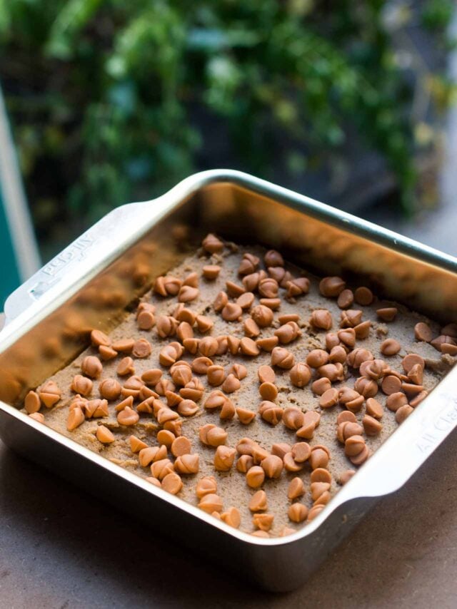 - Preheat the oven to 350ยบF (180ยบC.) Line the inside of an 8-inch (20cm) square baking pan with foil so it overhangs up and over the edges, which'll make the bars easier to lift out after baking. Butter the foil with melted butter or spray with non-stick spray.