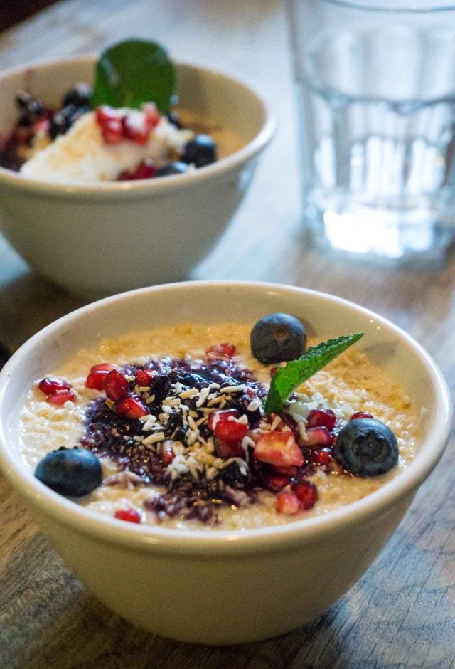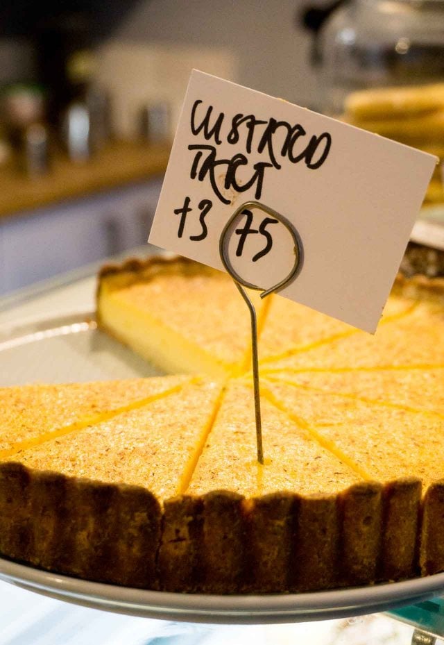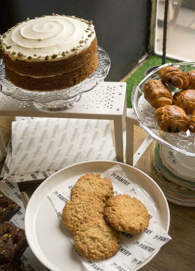 Our first stop was The Pantry for some porridge โ and Scotch โ at 9:45 am. This friendly little cafe offers up simple but hearty food, the kind you want/need to eat in the morning before a morning of tasting Scotch (and chocolate, cheese, cakes, and fish & chips), along with a selection of house-made cakes, croissants, and local breads, which were being delivered as I tried to explain โporridgeโ to Romain, which doesnโt quite translate. In fact, the French just call itย porridge as well. A few porridge bars and cafรฉs serve bowls of it in Paris, but I donโt think many eat it for breakfast. And Iโm certain they donโt accompany it with a belt of Scotch, like we did.