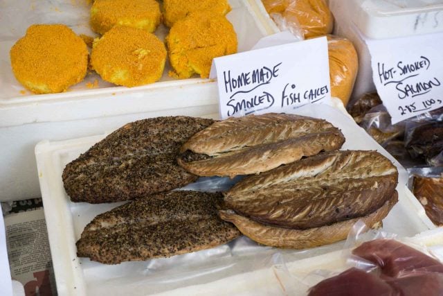 There was some lovely fresh (local) fish, but what really got me excited was the smoked fish. The selection was amazing. I was traveling light (carry-on only) but made sure that I had room to bring a few things back. When I reached for a package of black pepper-smoked mackerel at Skipness Smokehouseย stand, Charlotte said โOh. Arenโt you going to get the one without black pepper, so you can taste the mackerel better?โ