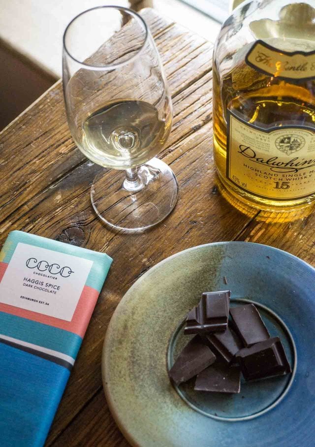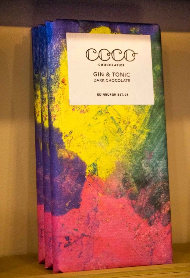 We did like the Haggis-spiced chocolate with the Scotch. The mix of black pepper, allspice, nutmeg and cloves went well with theย slightly smoky sips. My favorite chocolate at the shop was the bar flavored with caramel, hazelnut, and Isle of Skye sea salt, although the gin & tonic was the one was we were most eager to experience, flavored with juniper oil, as well as lemon and lime. We didnโt have any onย hand, but I should have brought a bar home to pair with some gin.