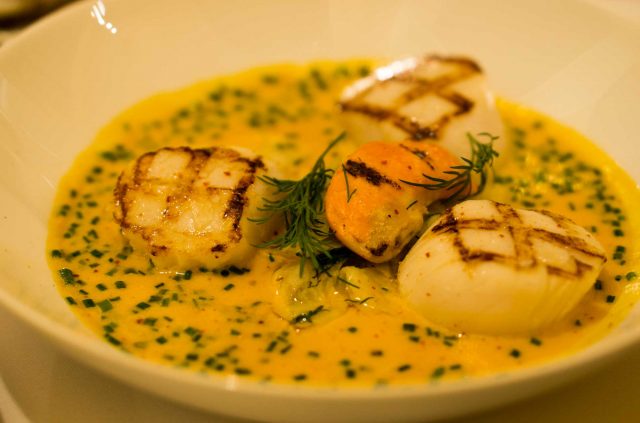 We started off with an outstanding platter of Loch Fyne Scottish oysters, and then a bowl of hand-harvested scallops.ย Jรฉrรดme Henryโs mastery of classical techniques was evident in the excellent fennel-saffron sauce that was pooled under the exceptionally fresh scallops, which we all agreed were excellent. Two in our group ordered the Isle of Gigha halibut with capers and brown shrimp, which could have been taken off the heat a little earlier, but we ended the meal with a lively lemon sorbet topped with candied bergamot and a shot of local gin to douse our tangy scoops. Or drink separately.