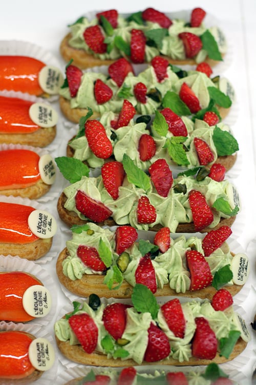 There was an รฉclair decorated in preparation for Bastille Day, which is called le 14 juillet in France. I didnโt try it because in spite of my classicist roots, I really do draw the line at eating likenesses of historical figures. I was wowed by Fraisier, an รฉclair filled with Iranian pistachio cream, orange flower water, and decorated with brilliant-red Gariguette strawberries.