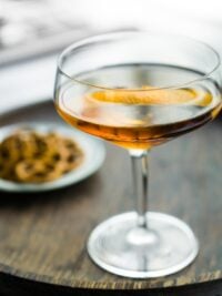 - Strain the mixture into a chilled coupe or cocktail glass. Hold the orange twist over the drink with the colorful side facing down, and squeeze the peel, misting the surface of the cocktail with flavorful orange oil. Discard the peel and garnish the cocktail with the cherry.