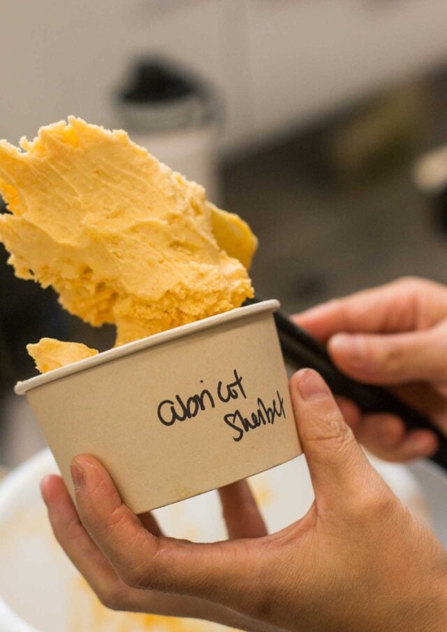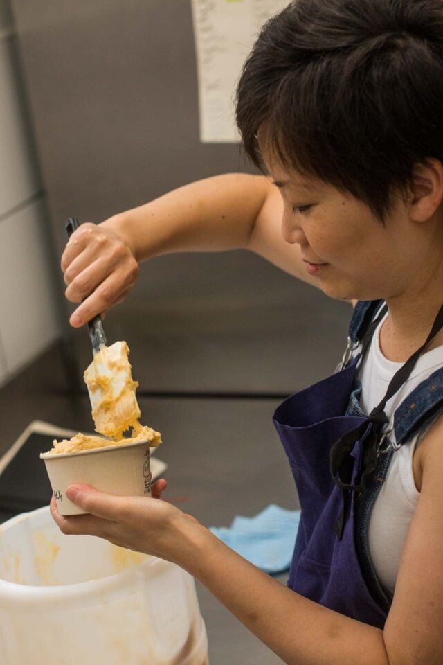 Apricot-Osmanthus Ice Cream has dried flowers they brought back from Taiwan. Soja (soy) is made with soy sauce, not soy milk, and brown sugar. When I asked about using soy milk he said that because they like to use only the best-tasting, freshest ingredients, they usually only use dairy since one can find great milk and cream in France. (Robert told me, โWe love dairy!โ) But if they found a good source for plant-based milk, theyโd use it.