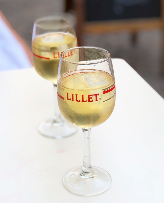 About a half an hour out of town is Lillet, made in the town of Podensac. Which means that at every cafรฉ and restaurant in the city Lillet white, red, and rosรฉ, are available. This fortified wine is flavored with oranges and spices, and is the perfect apรฉritif with a cube or two of ice floating on top. Itโs tougher to find in Paris and when you do find it, they donโt always know what to do with it. I recently saw it on a cafรฉ menu in the Marais, so ordered a glass, and the waiter brought over a tall, slender, and tiny glass of Lillet, that was tepid.