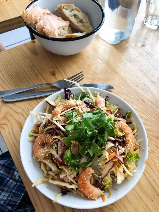 We did have a nice first day lunch at La Cagette (8, place du Palais) with a very friendly young staff, a good wine by the glass list (and reasonable, like most of the wine was in Bordeaux) and a fresh salad with crunchy cabbage, nuts, cilantro, and shrimp, that werenโt quite the big, beautiful shrimp you see at the fish markets. When the couple next to us got up to go out and smoke, I made a motion pretending I was going to grab a bite of their delicious-lookingย tartare de bลuf, but one of them saw me and got a chuckle out of it. And made a wagging motion with his finger for me not to do it.
