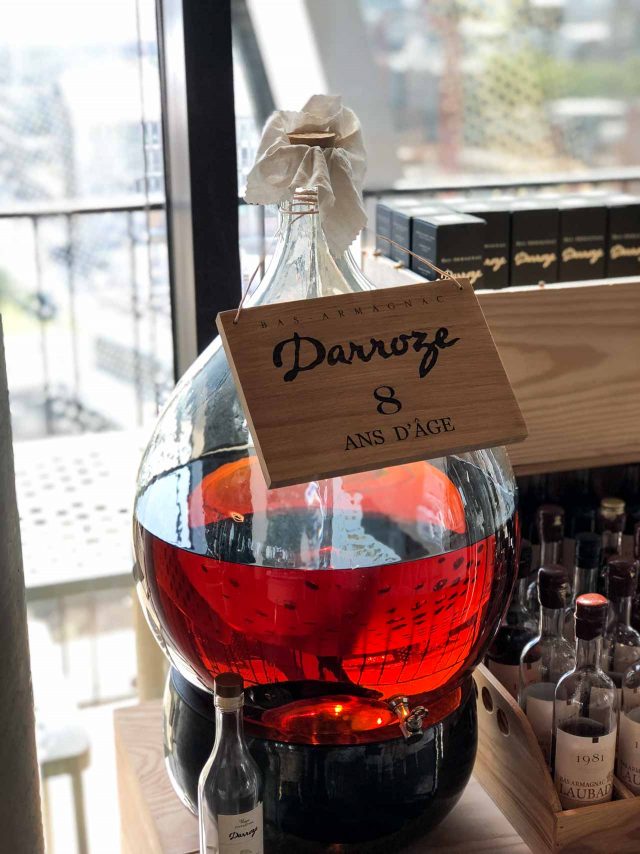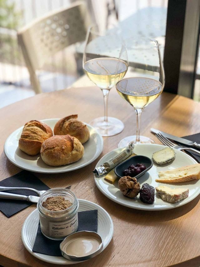 Another option in the city is theย Citรฉ du Vin, and ultra-modern wine โexperience.โ You can choose different admission prices that offer various tours, tastings, and workshops, but we took the elevator to the top floor L7 restaurant for a late afternoon snack. At mealtimes, youโll need to dine there, but midafternoon between 3 and 7 pm, thereโs a limited menu carte that offers up some bites to go along with a glass or two of wine. We had some marvelous duck rillettes and a cheese plate served with a date, a local walnut, some tangy berry chutney, and a slender tube of French butter, which went to good use.