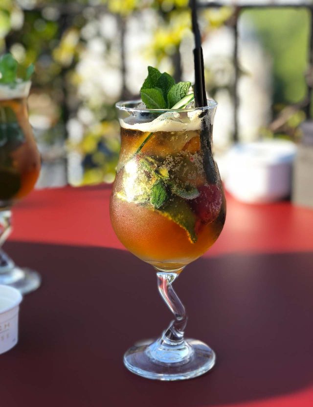 In especially nice weather, another place to go and check out the city from overhead is the Night Beach at the Intercontinental hotel. It wasnโt quite night when we got there, nor did it feel all that much like a beach โ although there is a hot tub that no one was usingโฆwe had Spiced Pimmโs Cups spiked with ginger beer.