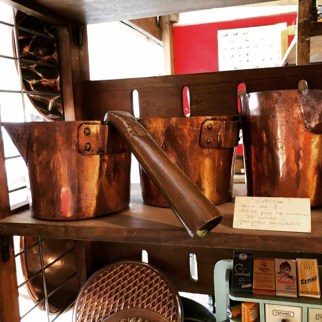 Since it was the around the tenth dayย of the market, there were very few bargains, if any. But it was fun to poke around and used the time to put some pictures on my Instagram account, rather than work on filling up my suitcase. When people saw the cassins, copper candy-making pots withย an oddly shaped interchangeableย handle (which no one could explain to me why it was bent that way), they asked me if there were any copper canelรฉ molds. I found several tins ones for โฌ1 each, and I probably could have bought & sold them later to pay for my pricey train ticket down here. (Due to the train strike, we got a refund on the inexpensive ticket that was purchased months ago, and had to buy a last-minute ticket for the next day, when the trains were running.)