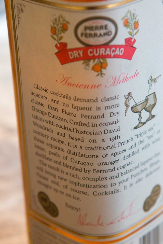 This drink also uses dry curaรงao, which isnโt the blue stuff in bottles (which is apparently making a comeback, which, for the record, I donโt support). And years ago I had a devil of the time finding non-blue curaรงao in Paris, but now thereโs curaรงao from Pierre Ferrand, a resurrection of what they say is the original way of making the orange-based liqueur.