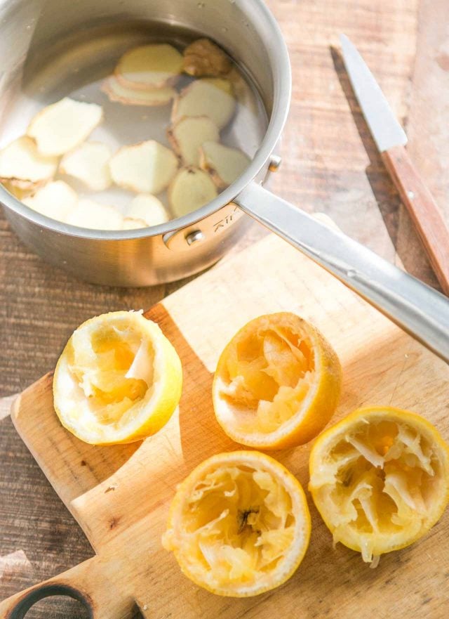 - Strain the ginger and lemon pieces from the sugar syrup and mix the ginger-infused syrup with the fresh lemon juice in a pitcher. Chill thoroughly. Serve with plenty of ice.