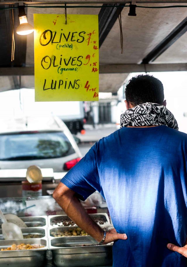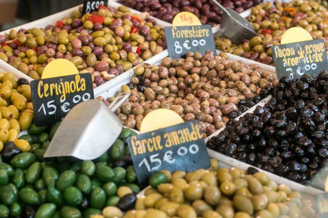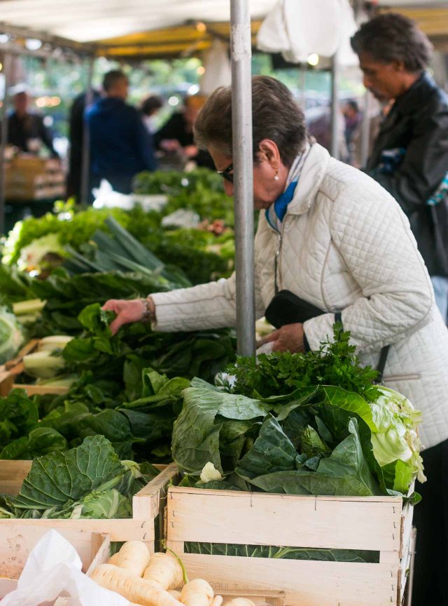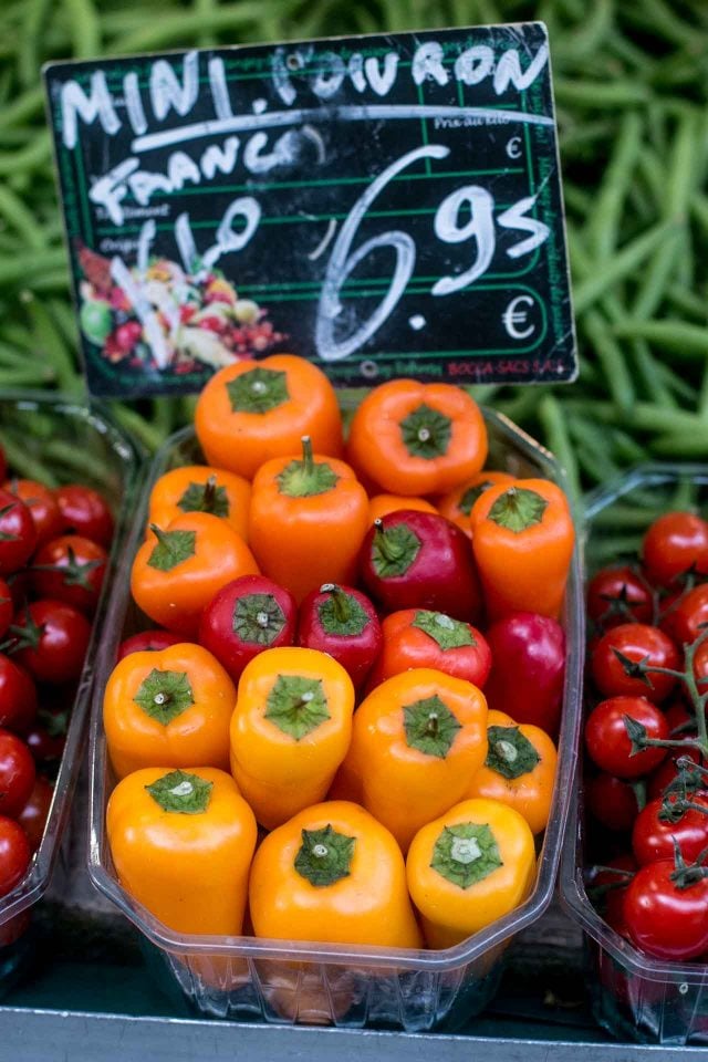 At a lot of the markets in France (notice I said โa lot,โ but not all), itโs strictly forbidden to touch the produce. That stance has softened at some vendors at some markets. I very, very, very much dislike people picking out my fruits and vegetables for me. Iโm more discerning than they are about what I bring home. A few people I trust to give me the right thing. And since Iโm a frequent customer, they are cool about giving me the good stuff. But I donโt run my hands over everything, and touch and squeeze. I handle each piece of fruit with care, raising it up to my nose, and taking a good sniff. When checking grapes, I donโt pull grapes off bunches, but ask if I can taste one of the loose ones : )