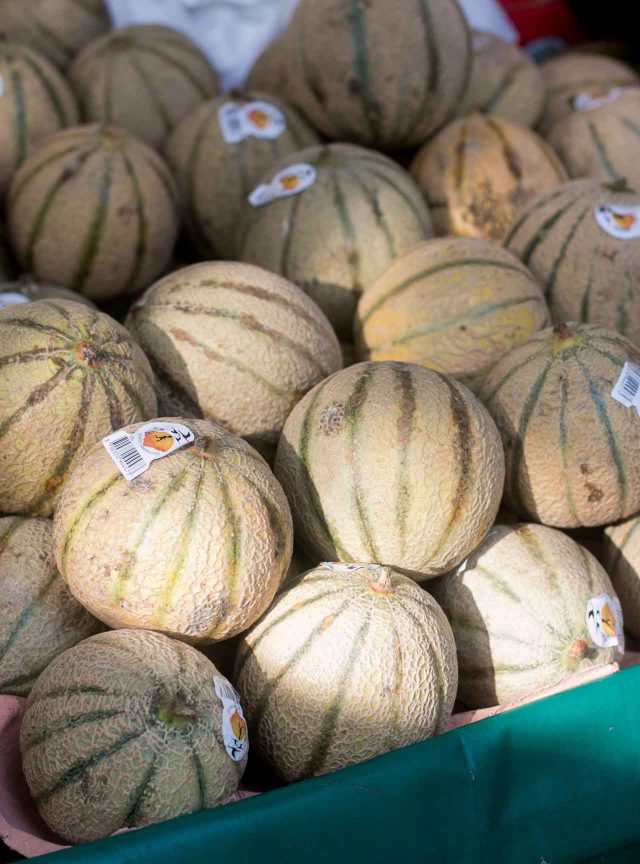 Weโre also seeing the last of the Charentais melons. Unlike the punky plums, melons are still hanging in there. In fact, theyโre about โฌ1 each, because theyโre trying to unload an overload of them. Rallying to the cause, I lugged home two melons, forgetting to save the heaviest things for my last pass through the market.