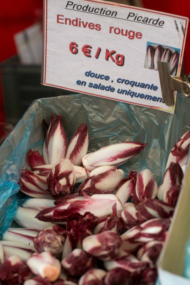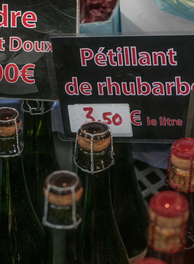 The apple growers at my market are from Picardy,ย (or Picarde), and have outstanding strawberries and fraises des boisย in the summer, and unusual ingredients in the fall and winter, such as red Belgian endive, in addition to apple juice, some flavored with cassis, and spritzyย pรฉtillant de rhubarb, which makes a nice apรฉritif, spiked with a little gin.