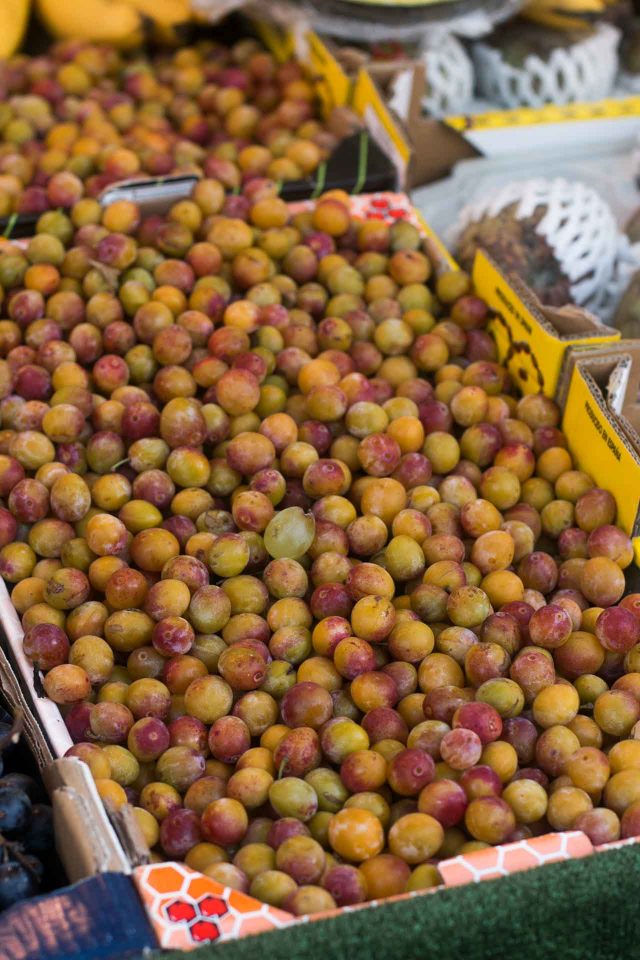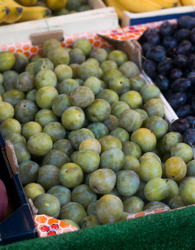 Another fruit thatโs popular in France is Reine Claude plums. These are SO GOOD, that you canโt believe it. Iโve had some wan ones, and some extraordinary ones. The green color isnโt an indication of ripeness, or non-ripeness either. (Some dark green ones are extraordinary.) So I go to vendors who let me taste one before I buy.