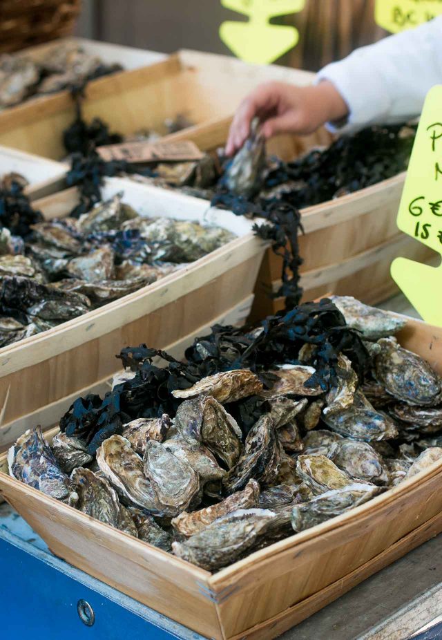 Oysters start showing up more and more at the markets, building a crescendo until Christmas, when so many are sold, they get stacked in crates on the sidewalks of Paris, and people buy โem by the box.