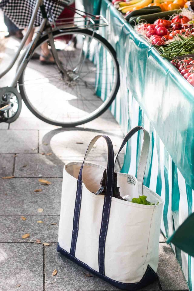 Speaking of which, a few years ago, I inadvertently found myself grabbing my L.L. Bean Boat and Tote bagย before heading to the market, which I hadnโt used since prep school. Granted, Iโm not using the same one, but these are amazingly sturdy, have wide, flat bottoms, so things donโt get squished, and you can sling them over your shoulder, likeโฆwhen you bought melons at the beginning of the market and realize you have to carry them around with you while you do the rest of your shopping. Also the bottom doesnโt show any grit when you set it down on the ground to do your shopping.