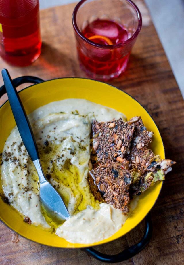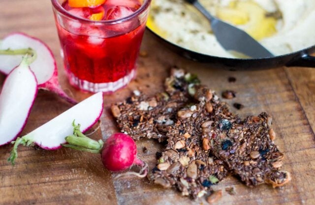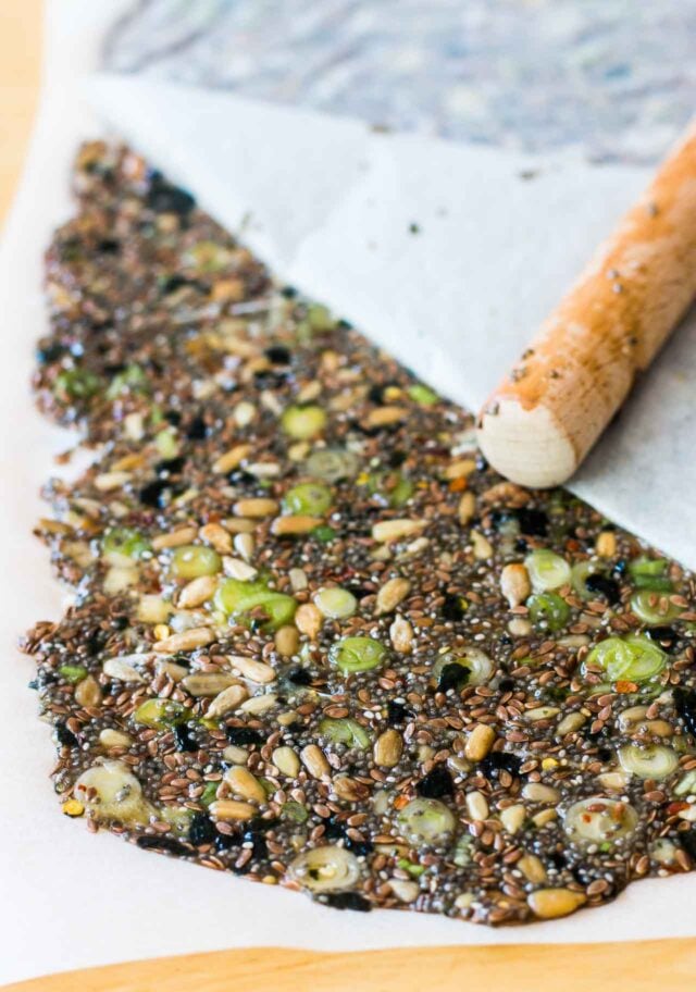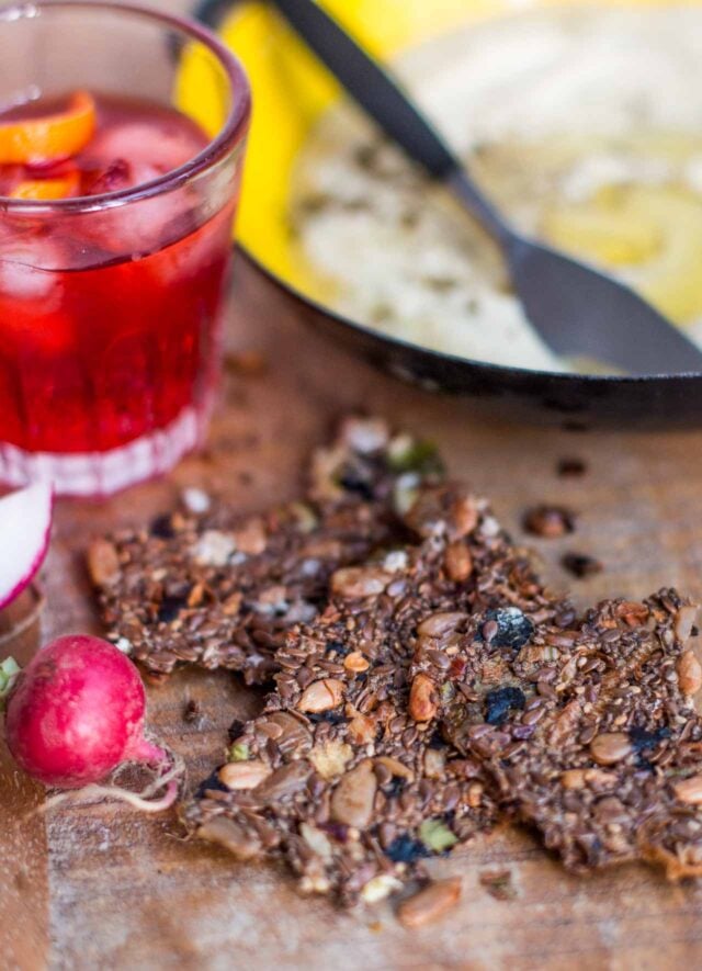 These Seedy Furikake Crackers hit the spot with the various dips and spreads Iโve been serving with them. Theyโre on the thinner side, so the operative word may be โspreadsโ as you might lose some of the cracker if youโre dipping it into something thick and rich. Theyโre super easy to make; you just mix the ingredients together and wait a few minutes, then roll the mixture between two sheets of parchment paper and bake them for 45 minutes, then โ voilร ! โ youโll have a batch of crackly, crunchy, freshly-made seedy crackers for your next apรฉro hour.