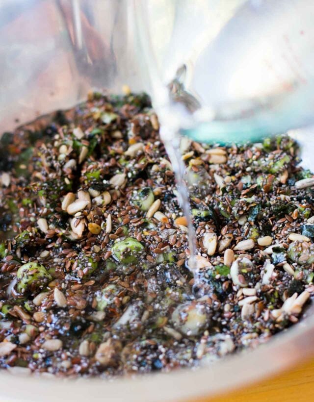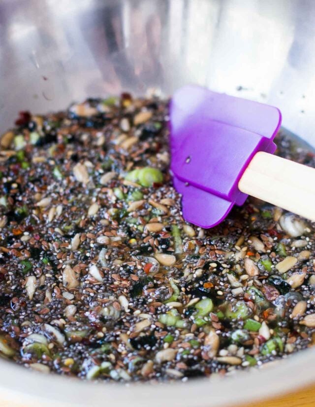 - In a medium bowl, mix the seeds, furikake, scallions, garlic, chile flakes, then add the water and stir until everything is well-incorporated, Let sit 3 to 5 minutes for the mixture to jell.