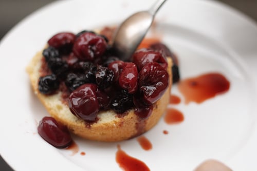 The auberge may be gone, but because I have a real sentimental soft spot for this book, and the food presented in it, it was a joy to recreate this classic French cake in my present-day kitchen. (Because if I canโt find angelica, I doubt that fresh antelope meat is going to be any easier to come by.) Itโs great paired with summer fruits and berries. Because itโs the season, I made a compote of sautรฉed fresh cherries by warming pitted cherries with a generous handful of sugar in a covered saucepan until very soft and juicy, about ten minutes, then added a shot of kirsch added at the end. If you prepare the cherries a few hours before you plan to serve them โ or even the day before โ the cherries get much more flavorful and the juices thicken into a glistening ruby-red sauce as they sit.
