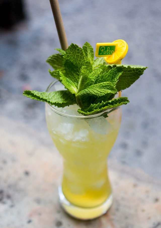 While some people find gentian-based spirits rather strong, in this gentle fizz, the bitterness is tempered by the pineapple juice and cold tonic water. All thatโs needed to finish it up is a flurry of fresh mint on top, and a straw.