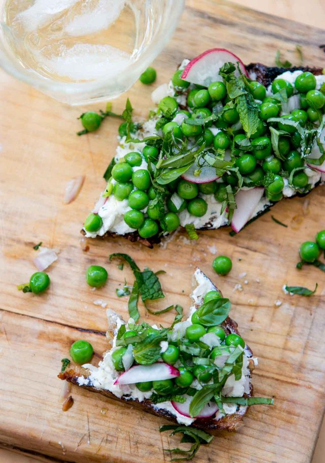 - Smear the garlic-rubbed side of each piece of bread with the goat cheese mixture. Divide the peas over the two slices of bread and press them in lightly. Garnish with sliced radishes and top with additional fresh herbs, shallots, salt and pepper, and a few drips of olive oil here and there.