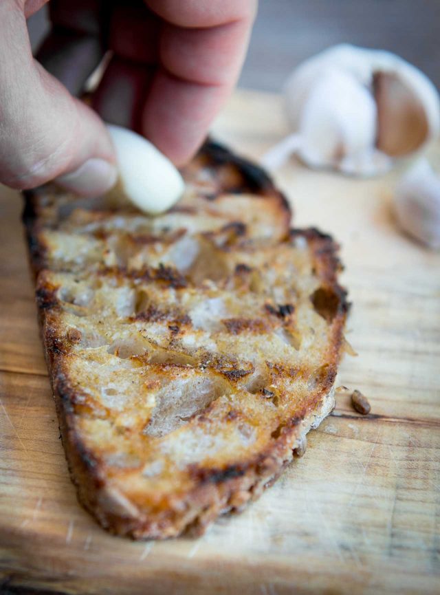 - Toast the slices of bread by brushing one side of them lightly with olive oil. Grill the bread, oil side down, on an outdoor grill or grill pan until golden brown. Turn the bread and grill until the other side is slightly crisp. Remove the breads from the grill and while they're still warm, but cool enough to handle, rub the oil-brushed sides of the breads vigorously with the raw garlic. (If you don't have a grill or grill pan, you can brown the slices of bread on a baking sheet in the oven, using the broiler or high-heat, about 400ยบF/200ยบC, watching them carefully if you use the broiler.)