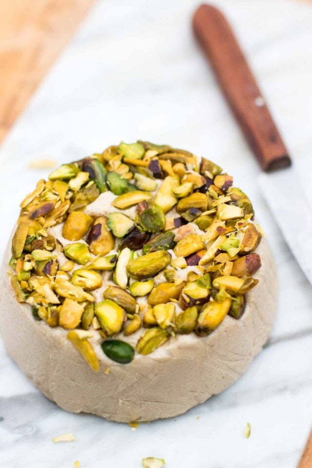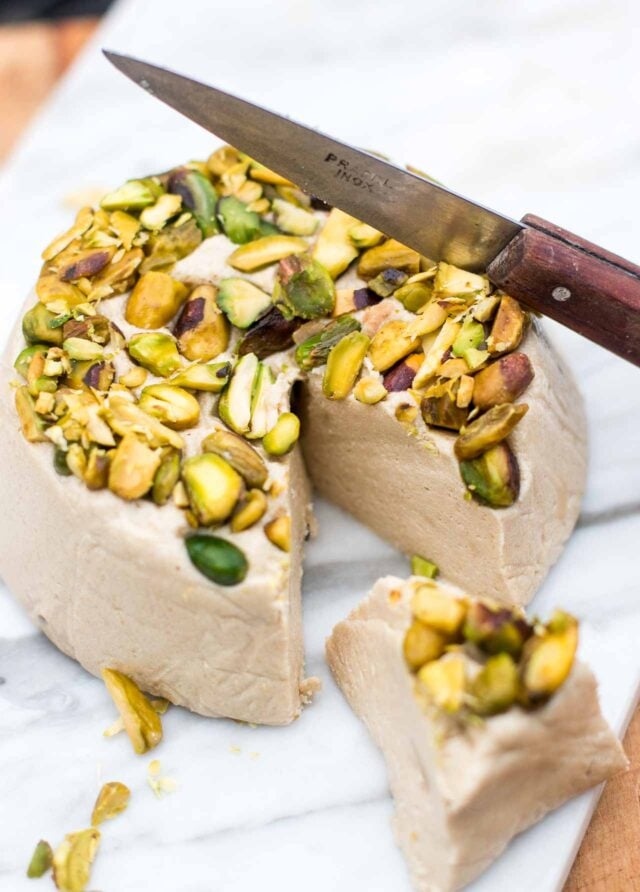 - Line a 3 cup (700ml) glass or plastic container of any shape with a sheet of plastic wrap that goes inside the mold and up and over the edges. Smooth out any wrinkles as best you can and put the pistachios in an even layer on the bottom. Press the halvah mixture into the mold and smooth the top. Rap the container a few times gently on a folded kitchen towel on the countertop to encourage the mixture to pack snugly in the mold. Cover with the plastic wrap overhang and refrigerate for at least 4 hours or overnight.
