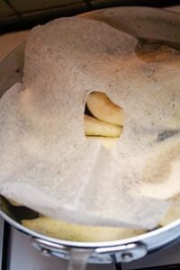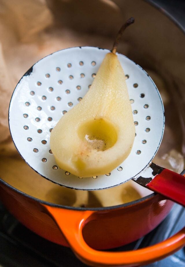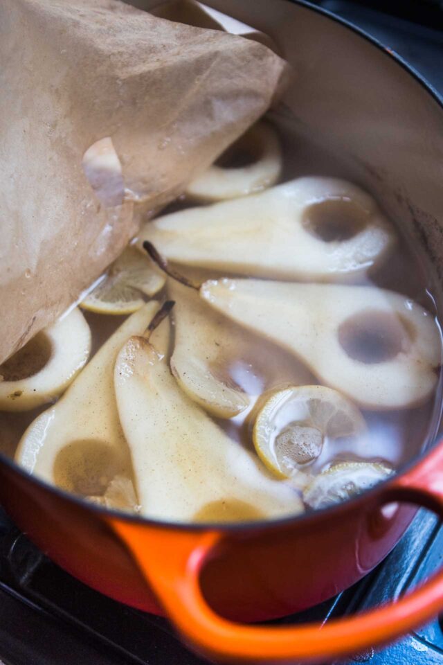 Poaching pears couldnโt be easier, but during cooking, the one thing you want to watch out for is the pears either poking out of the water or not cooking them enough. Either will cause the pears to discolor. You want to make sure they cook evenly, and to remain submerged in liquid. To prevent this, I craft a circle of parchment paper to fit over the top of the pears while theyโre cooking with a vent hole in the middle to let the steam escape.