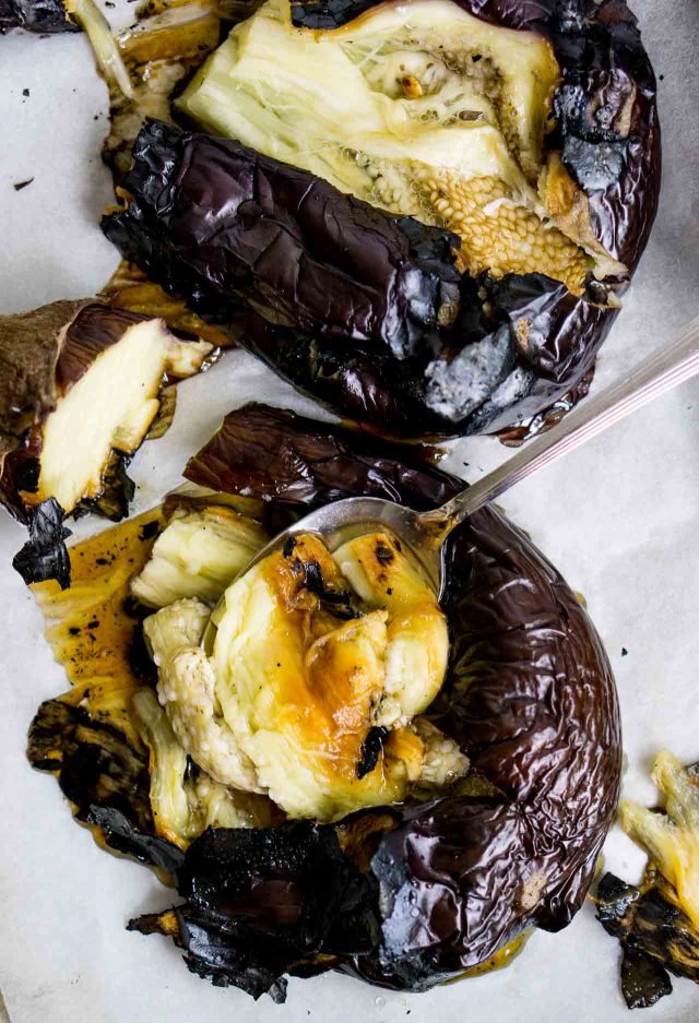 - Prick the eggplants a few times around them with a paring knife. Set the eggplants directly over a gas burner and roast, turning occasionally with tongs, until they are soft and wilted, 5 to 10 minutes. (The longer you leave them on the flame, the more "roasted" they will taste.) Place the eggplants on the prepared baking sheet and bake until they're soft all the way through, 20 to 30 minutes.