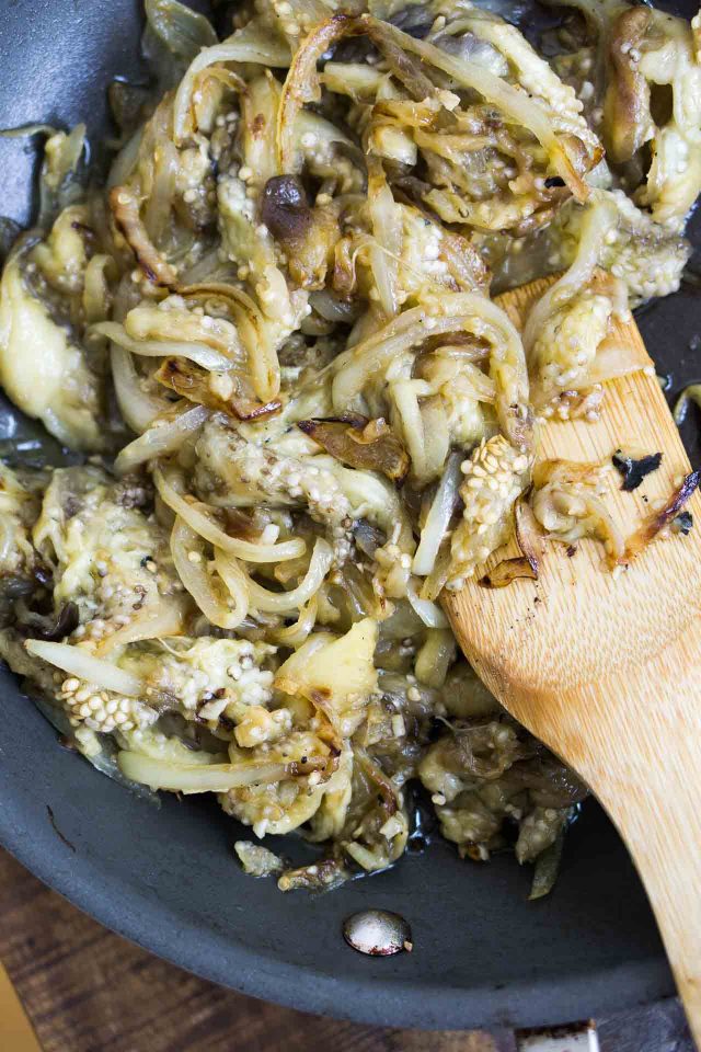Eggplant isnโt the prettiest thing to photograph, but when sautรฉed with good olive oil, onions,ย and garlic, it turns into something silky,ย and tasty, and works magically as a base for (and with) other flavors. And regarding olive oil, people forget that olive oil isnโt just something that keeps foods from sticking to the pan. Itโs a flavor. I thought the original recipe in the book had too much, but corrected myself after I stirred in the eggplant when I was cooking it, and found that it was necessary for moisture, and โ yes โ for flavor, when I tasted it later.