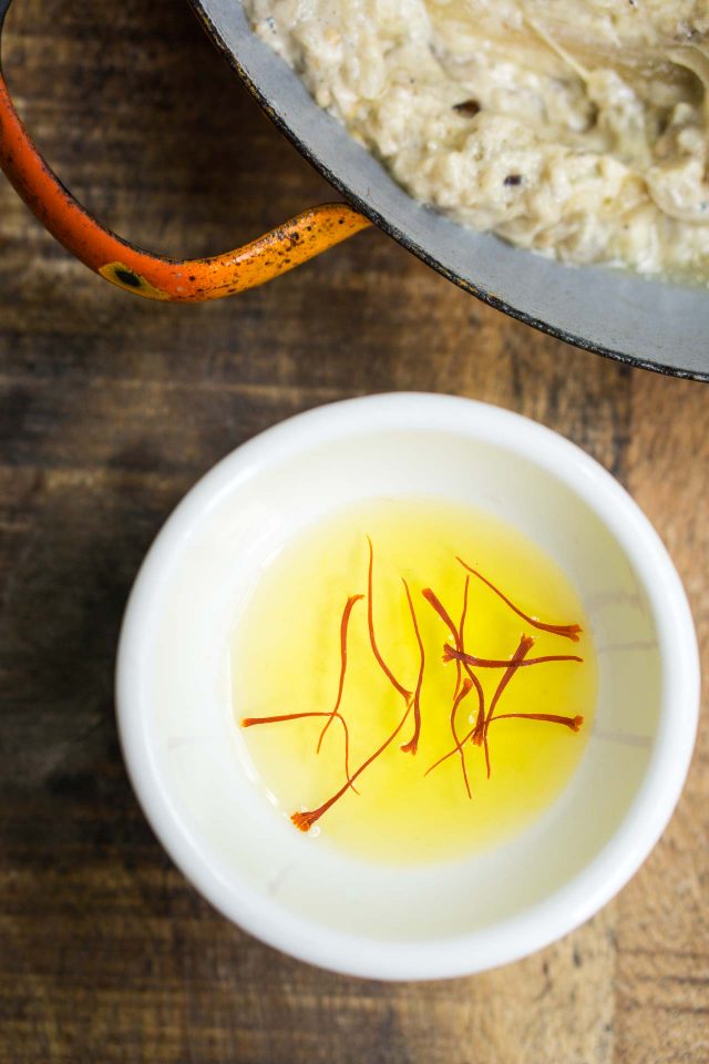 The recipe also gave me the chance to finally crack open the saffron I got in Sicily. Real saffron anywhere is expensive, but there isnโt anything else like it. Using something else is like substituting nonfat milk for cream in a recipe; the extra expense is worth it. Fortunately, you donโt need a lot for this recipe, but saffron really does heighten everything it lands in, including this spread. A lovely Iranian woman gave me some saffron from her homeland a few years ago at a book event and itโs so precious to me that I keep it very well-hidden. (Come to think of it. Where did I put that?โฆ)