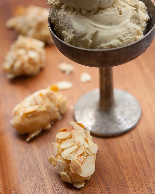 - Roll and press the ovals of dough into the almonds, being extremely generous coating when coating with the almonds. I start with 1 1/2 cups of sliced almonds in the bowl, and add more as necessary. After coating each batch of cookies with the almonds, put them on a baking sheet, evenly spaced apart. (You may need to press the almonds well into the cookies to get a lot of them to stick, and the cookies may lose their perfect oval shape – which is fine, the cookies should be a bit rustic.)