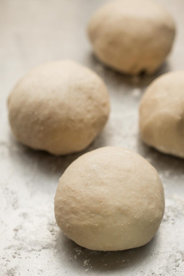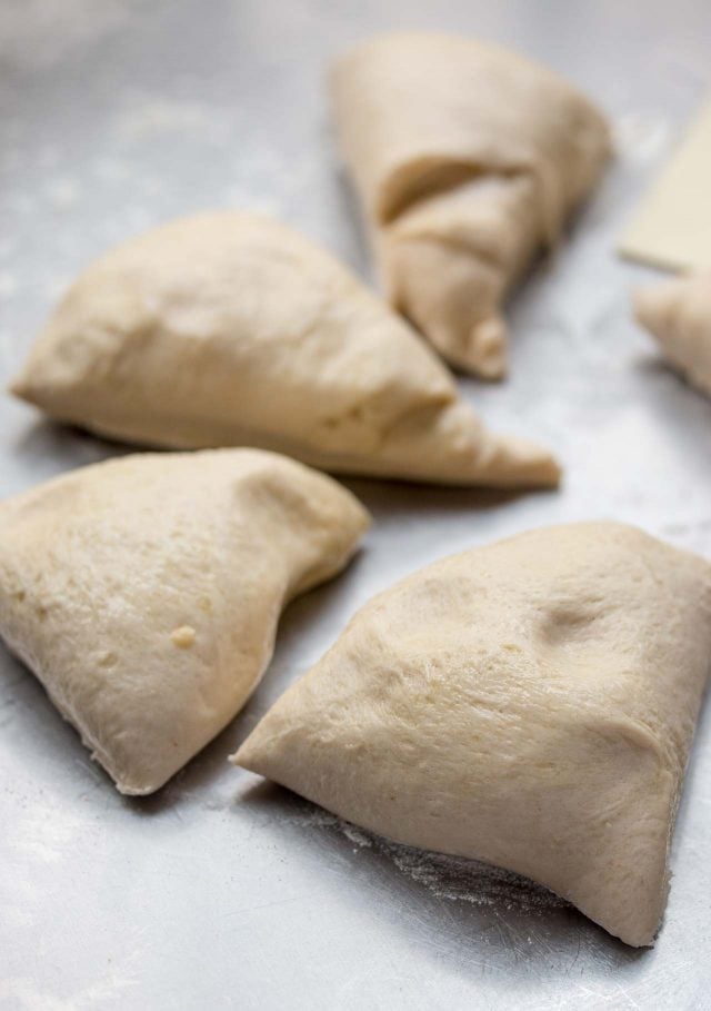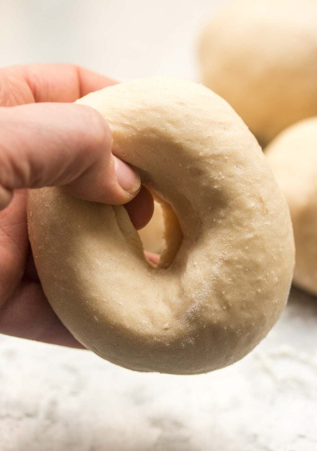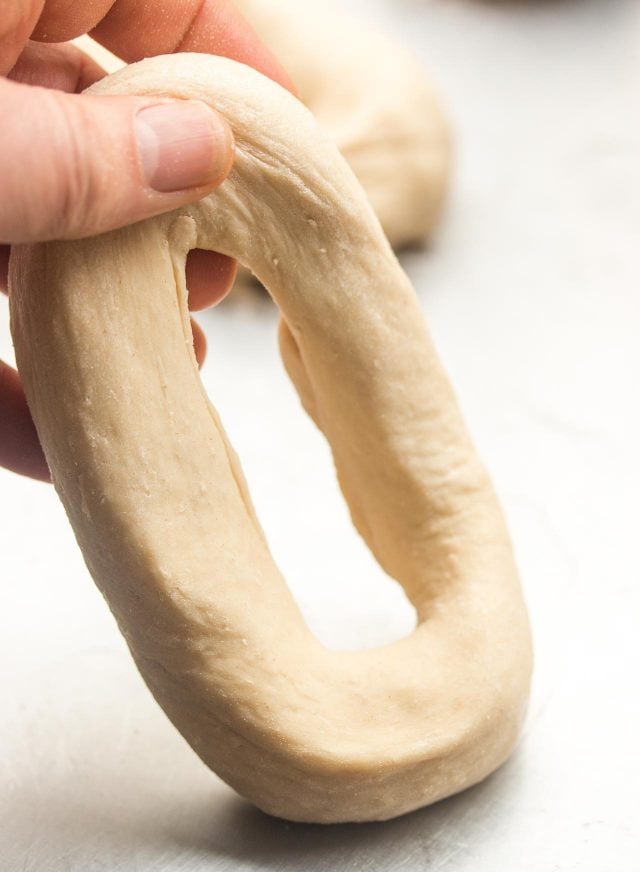 - When the dough has risen after 1 hour, punch it down and turn it out onto a lightly floured countertop. Divide the dough into 6 equal pieces. Grab one piece of dough in your hands and shape it gently into a ball on the countertop, without overworking it. Dig your thumbs into the center to create a hole and stretch the dough outward to create an oval ring about 6 inches (15cm) long, using your fingers to pull and shake the dough so the hole is as large as you can make it.