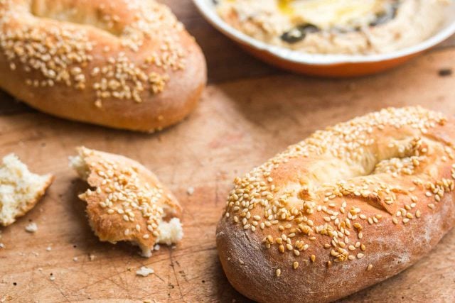 Unlike chewy, New York bagels, these are more bready and airy, so theyโre better for scooping up dips; good options are hummus, hummus with spiced lamb, baba ganoush, eggplant caviar, white bean dip,ย tarama, or a bowl of good olive oil and some zaโatar, although we also enjoyed them for breakfast, toasted and buttered as well.