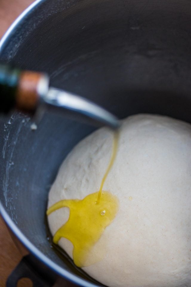 - Rub a little olive oil over the top of the dough, cover the bowl with a tea towel, and let rise until doubled, about 1 hour.