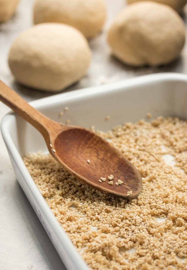 - Grab each oval ring of dough and press the top of each into the sesame mixture, then give the dough another tug and pull, coaxing the hole in the center even larger. Place each sesame seed-dipped oval on the baking sheet, seed side up, and let rest 10 more minutes.