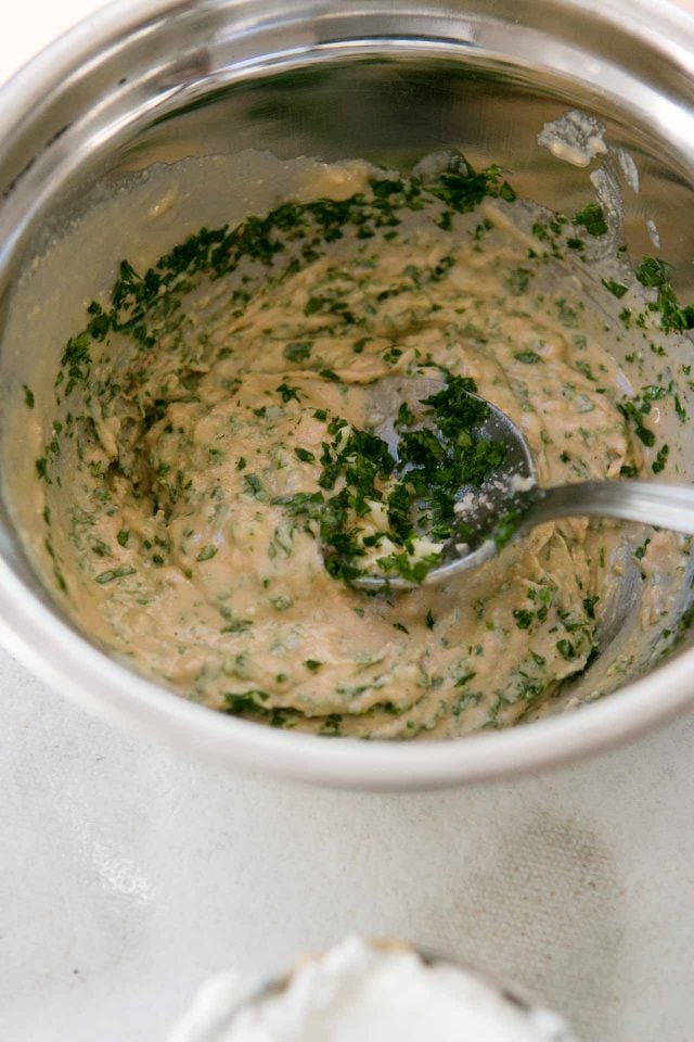 - In a medium-sized bowl, mix together the tahini, garlic and salt.