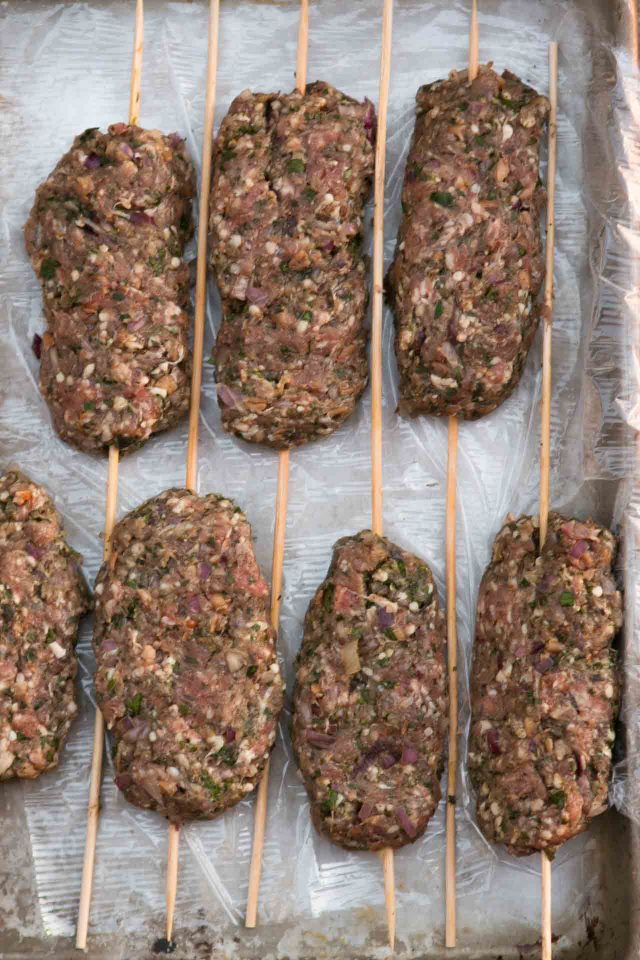 - Divide the ground lamb mixture into 8 portions and using your hands, shape one part into an oval about 4-inches (10cm) long. Press one skewer in the center then use your hands to mold the lamb around the skewer, finishing by pressing it flat. Lay it on a tray or plate, and repeat with the remaining ground lamb and skewers.