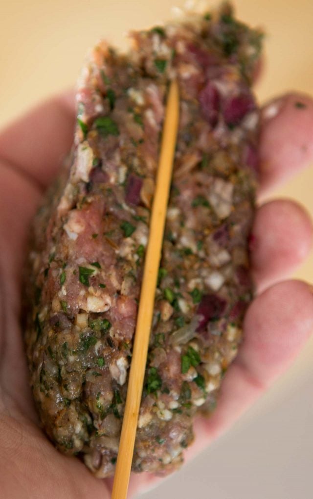 Elisabeth recommends adding the meat to skewers in several (two or three) steps, which she says helps the meat stick together. I went rogue and made ovals, which worked โ well, mostly. I did have one fall off the skewer when I turned it over, so next time, Iโll heed her advice.