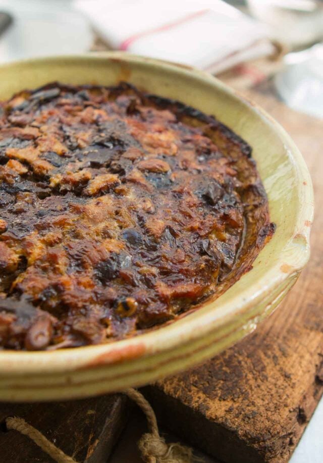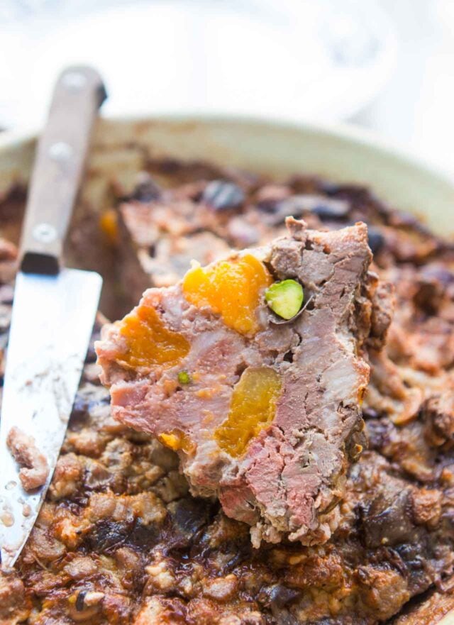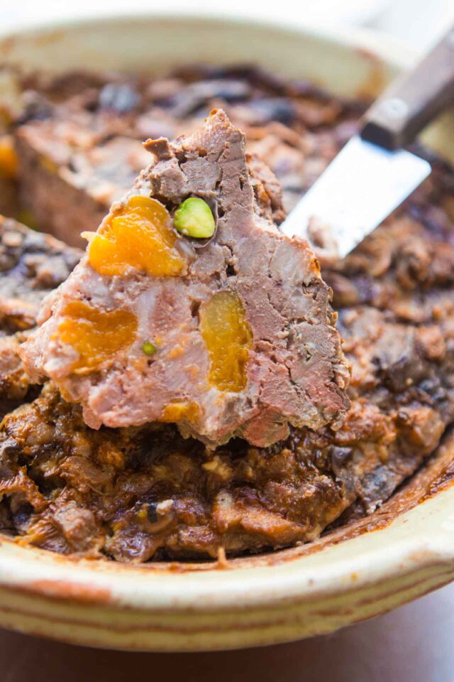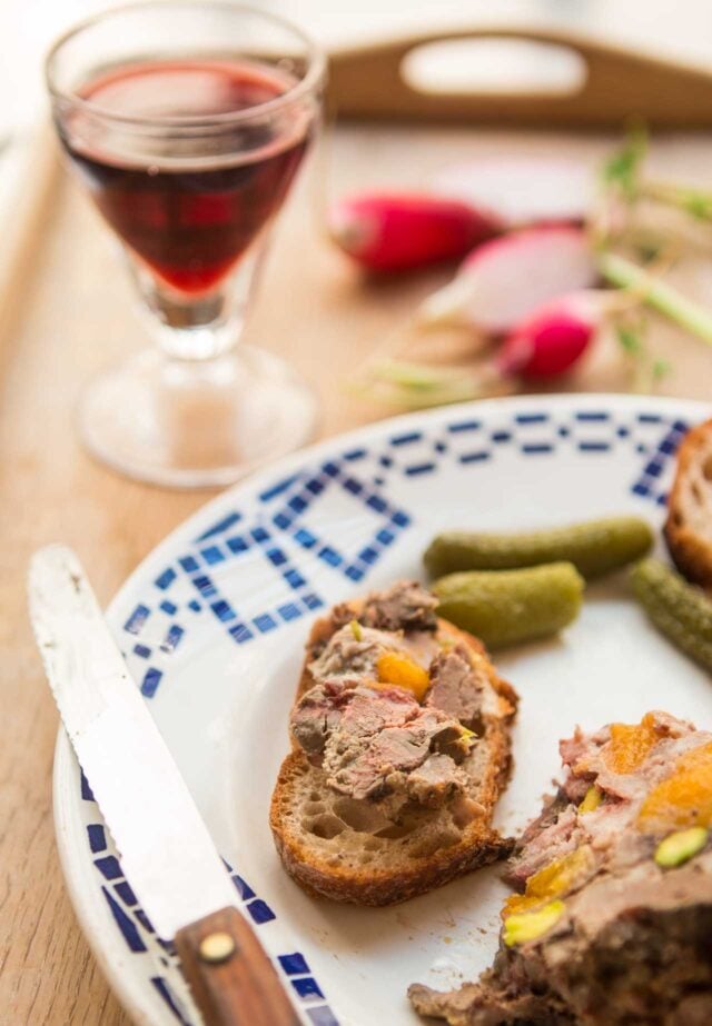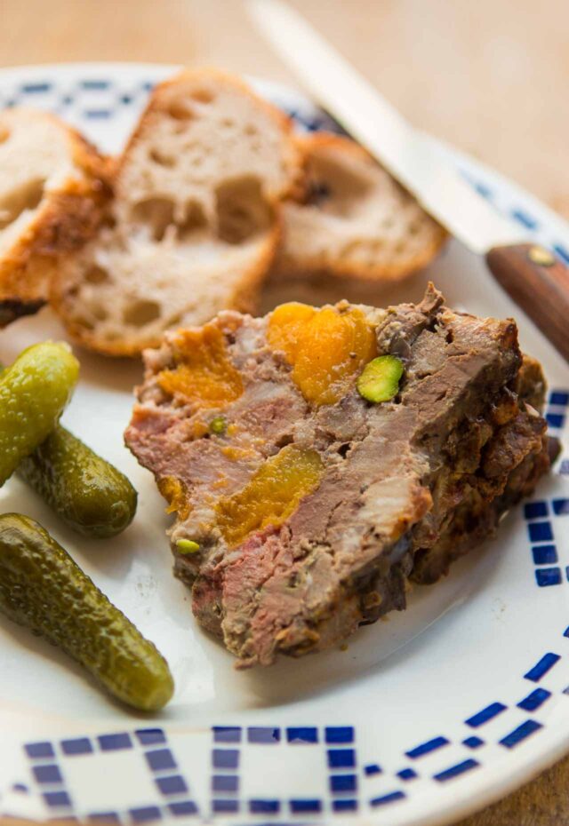 It amuses me when people talk about snooty people sitting around, leisurely eating pรขtรฉ, because pรขtรฉ is rustic, country fare, not considered fancy in France. While pรขtรฉ can have a pastry-type crust (pรขtรฉ en croรปte) and some are a little fancier than others, the cousins of pรขtรฉ, terrines, are truly down-to-earth. They can be baked in a special mold (you can come across them at French flea markets for around 5 bucks, like the one I used here), they can also be baked in any ovenproof bowl, which I did with this terrine. So thereโs no excuse not to sit around and eat pรขtรฉ, or terrine, all day. And not only is this one incredibly easy, itโs also one of the best terrines Iโve ever had.