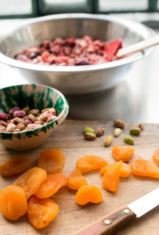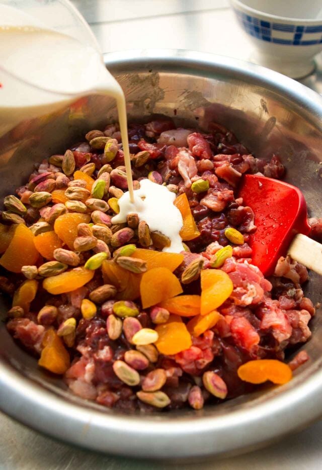 - Mix the heavy cream, apricots and pistachios into the meat mixture. Transfer the mixture to the baking pan or mold, smooth the top, and cover snugly with foil. Add hot water to the larger pan the terrine pan or mold is sitting in, so it's coming up halfway up the sides of the pan or mold. Bake for 35 minutes, then remove the foil and bake another 35 minutes, or longer, until the terrine is done. (My terrine baked in a clay bowl took longer to bake than in the metal loaf pan I used the second time I made this; after removing the foil, mine in the bowl took an additional 65 minutes. If using a loaf pan or rectangular pรขtรฉ or terrine mold, it should be done after removing the foil and baking it for the remaining 35 minutes.) You can verify the temperature with an instant-read thermometer, which should read 150-155ยบF (66-68ยบC) when done. The temperature of the terrine should continue to rise to 165ยบF (72ยบC), considered aย safe temperature, after you take it out of the oven.)