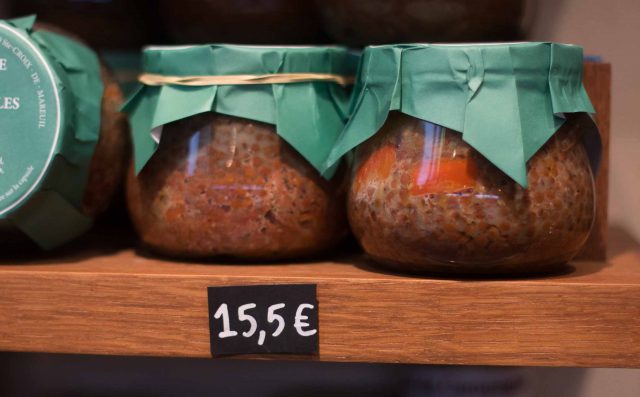 As popular as cheese is in France, charcuterie gives it a run for the money. Although I didnโt get a picture of the one I bought from the inside, the duck rillettes with a generous circle of foie gras in the center were a hit when I got them home and served them at a dinner party. To be honest, it takes a lot to elicit excitement or to get a Jโadore about charcuterie, in a country where thereโs no shortage of mighty fine cured meats, terrines, and pรขtรฉs. But this one did.